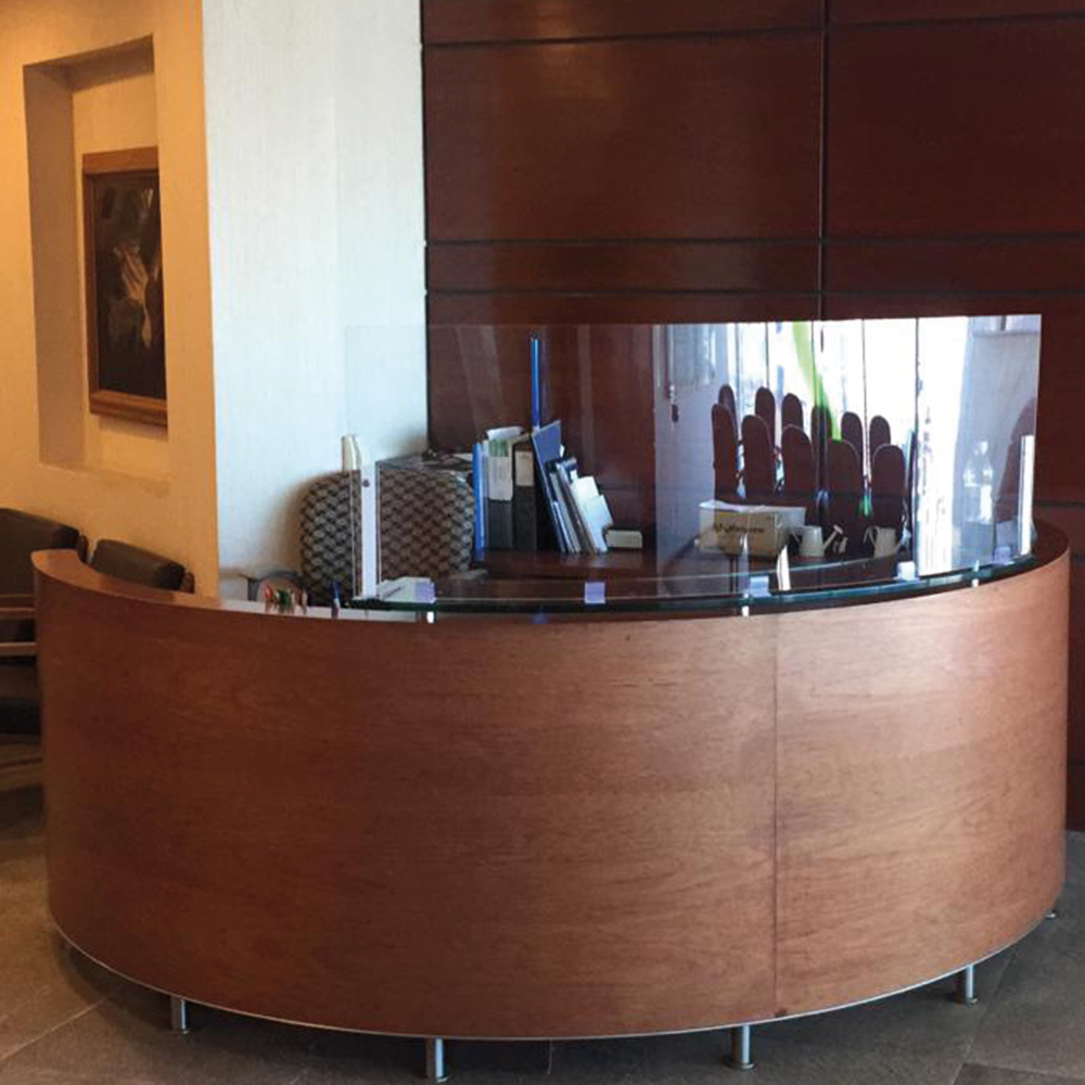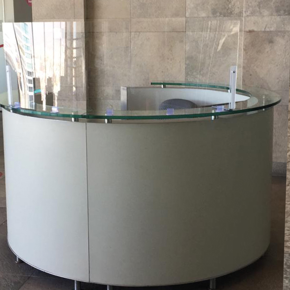 Fabricamos acrílicos curvos para recepciones ovaladas. Estos van con sujeciones de stopper, el formato de “L” que van con doble contacto hacia la mesa y con pernos que sujeción con fijación al acrílico. Esto acrílicos por lo general son de 2 a 3 mm.