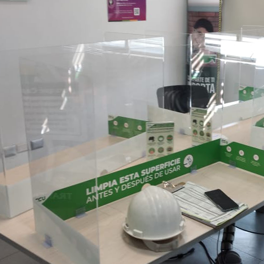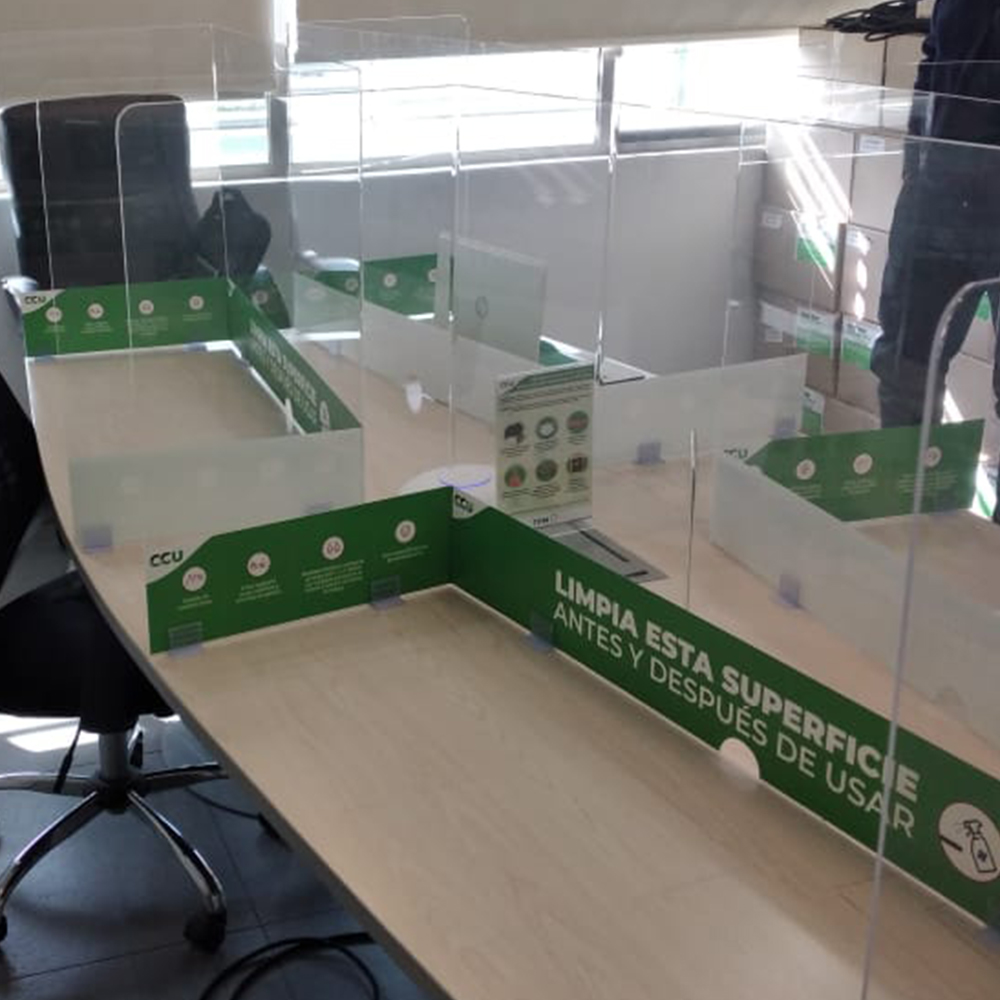 Estos son realizados para mesas de reuniones muy grandes. Por lo general tiene una longitud de 120 o hasta 160 cm de largo, sobre la cual se recomienda que se utilice otro separador extra para agregarle al tamaño. Estos van con cuatro soportes en “L” de 5 mm. Los soportes son con doble contacto y un tornillo de perforación para generar una fijación segura hacia el acrílico. El doble contacto va hacia la mesa, ya que no produce daño al momento de retirar y evitar perforaciones.